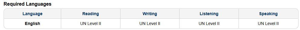 English and French are the working languages of the United Nations Secretariat. For this job opening, English is required. The table below shows the minimum required level for each skill in these languages, according to the UN Language Framework (please consult https://languages.un.org for details).